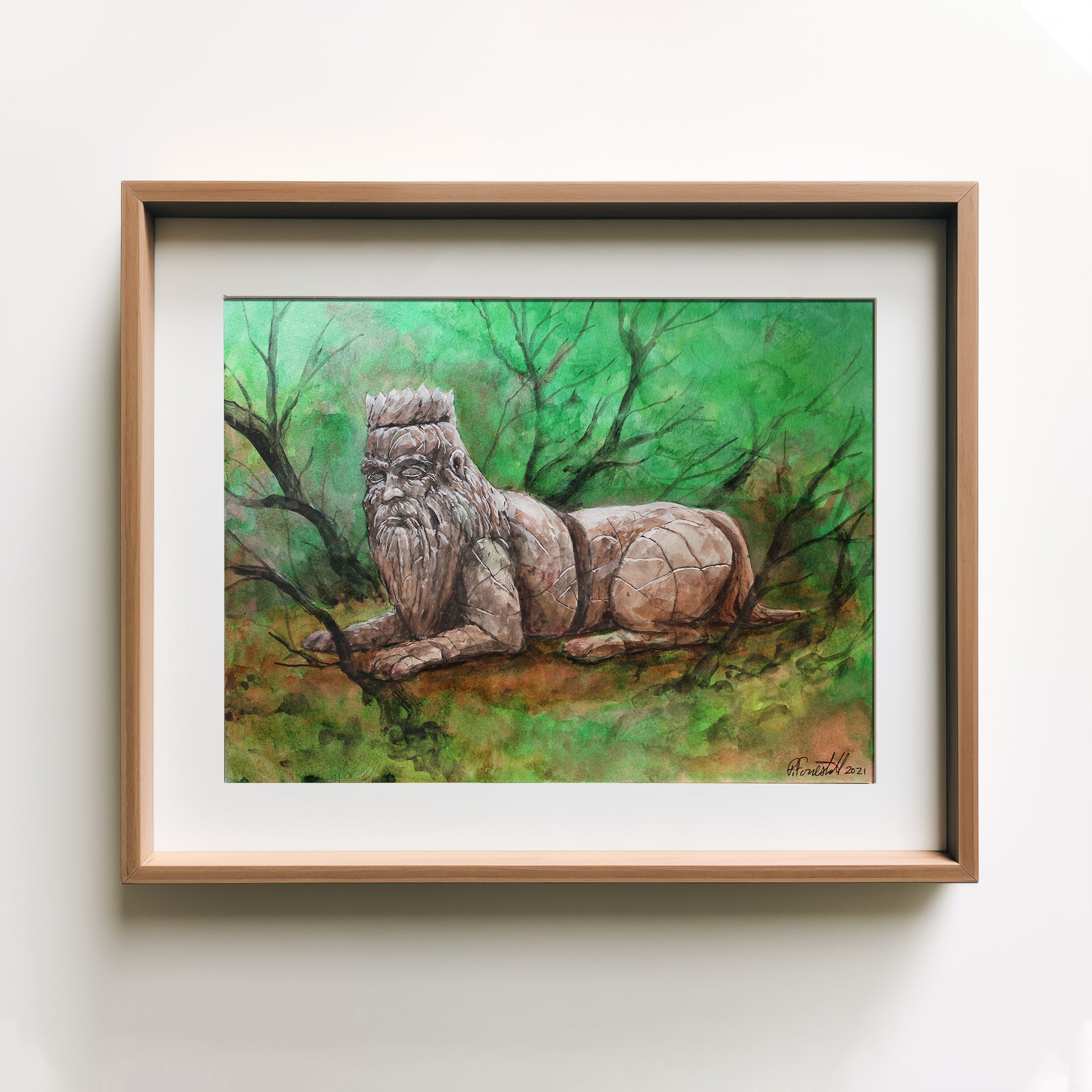 An ancient and Kingly sculpture lost in a deep woods.