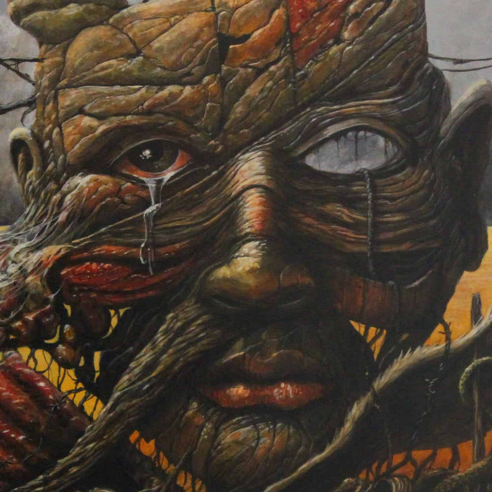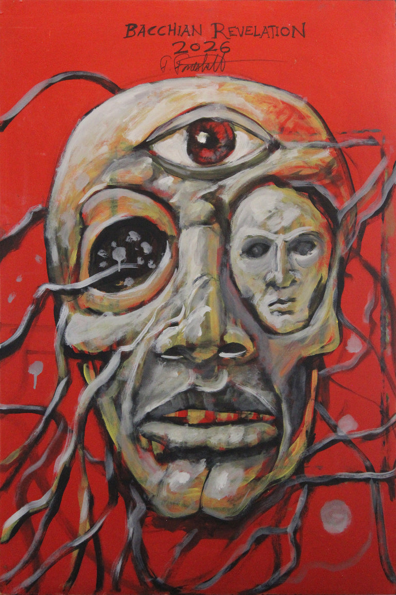 Bacchian Revelation unfolds like a vision granted in the fevered aftermath of a forgotten rite. The fractured head rises from a barren desert beneath a heavy sky, its cracked brow sprouting antlered growths as if the mind itself were reverting to something older and wilder. One eye weeps while the other is gone entirely—a hollow opening through which the distant clouds are visible, as though part of the self has eroded away, leaving only sky where vision once lived. Around the figure gathers a dense congregation of symbols—fruit, beasts, roots, flesh—like offerings piled at the feet of an ancient god. Telephone poles march across the desert like thin modern totems, their wires humming faintly above a spiritual wasteland. In this strange union of decay and abundance, Bacchian Revelation suggests the moment when the mask of civilization cracks open and the deeper Bacchic force—ecstasy, instinct, fertility, and ruin—briefly reveals itself beneath the surface of the modern world.