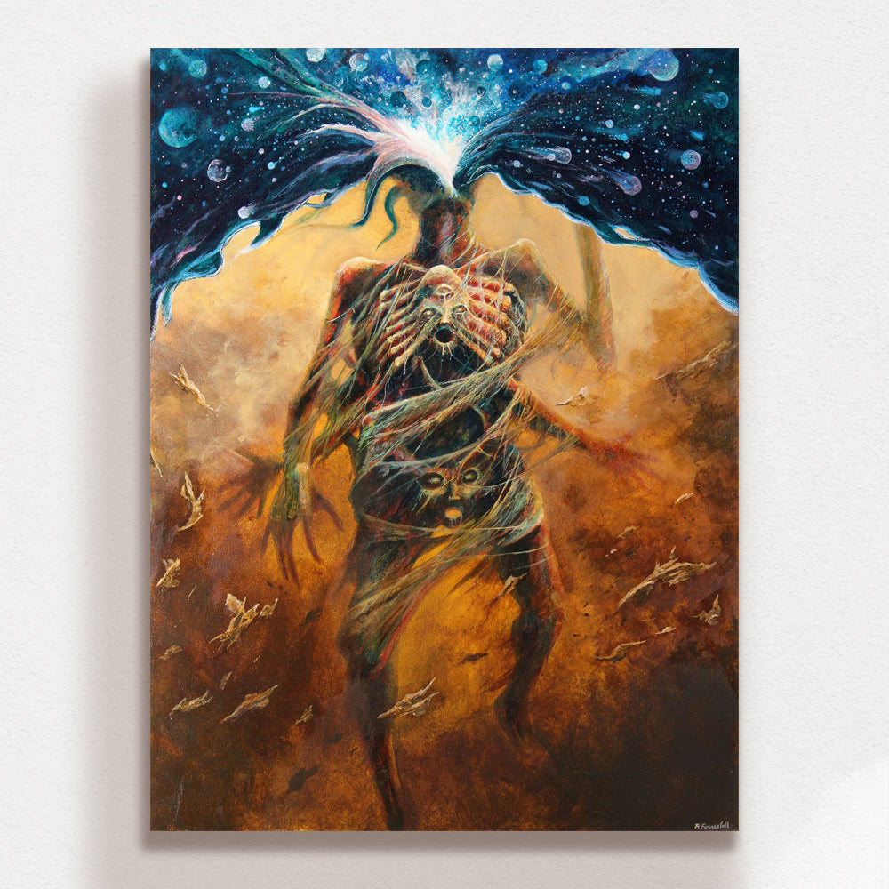 Around the figure swirl fragments, wings, and broken shapes, like the detritus of unformed worlds, reminding us that creation and destruction are inseparable. The being strides forward, looming and immense, caught between dissolution and genesis.