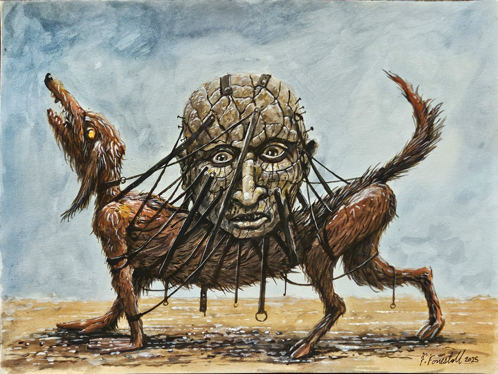 In Reluctant Pilgrim, a dog-like creature advances hesitantly across an empty plain, its body pierced and tethered to a massive human face it carries like a living reliquary. The face appears weary yet resigned, bound to the animal by cords that suggest obligation rather than choice. The image evokes themes of duty, inherited belief, and the burden of conscience—where forward motion is compelled, not freely chosen. The painting captures the uneasy tension between faith and doubt, portraying pilgrimage as endurance rather than devotion.